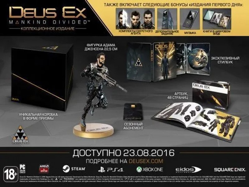 - Эксклюзивный стилбук. Металлическая упаковка с игрой, оформление которой проводит параллель между Адамом Дженсеном и героем древнегреческого мифа Икаром.